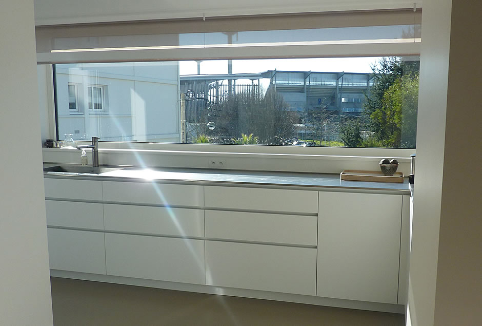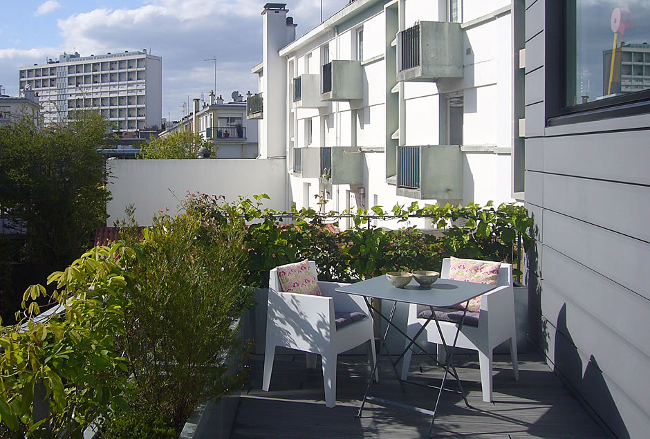 Cette extension crée un volume pour une cuisine entre le batîment existant et la toiture basse transformée en terrasse.